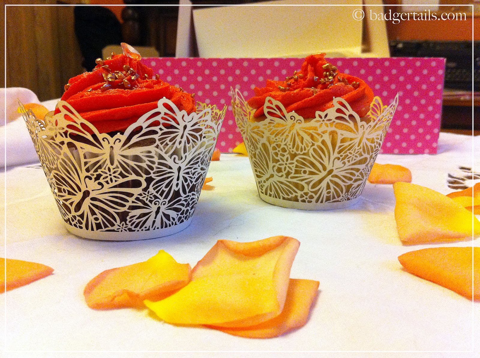 They are a mixture of vanilla and chocolate bases, the chocolate being cocoa powder with grated white chocolate in too. The coral frosting is flavoured with orange blossom water and sprinkled with bronze nuggets, silver stardust and topped with a single edible diamond each.